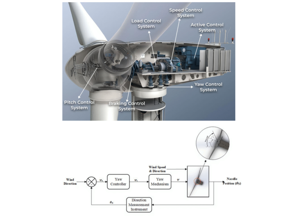 - A yaw control mechanism is integrated with modern turbines that continuously adjusts the nacelle to face the wind. This increases the turbine’s efficiency.